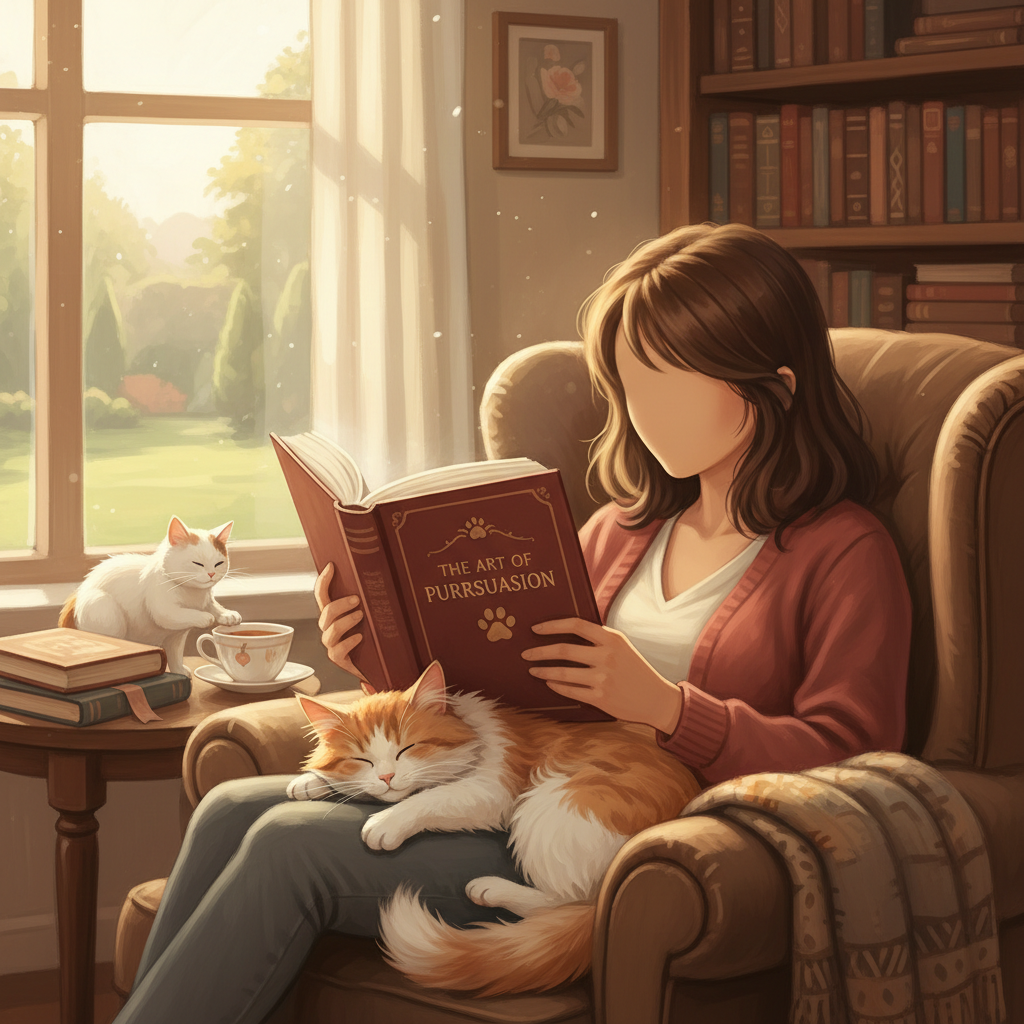 本を膝の横にずらしてみる。すると猫もそっちに移動する。反対側に置き直す。また移動する。まるでゲームみたいに、私が本を動かすたびについてくる。諦めて本を閉じると、満足したように私の太ももの上で丸くなって寝始める。その寝顔があまりにも平和で、さっきまでの攻防が嘘みたいに思えてくる。