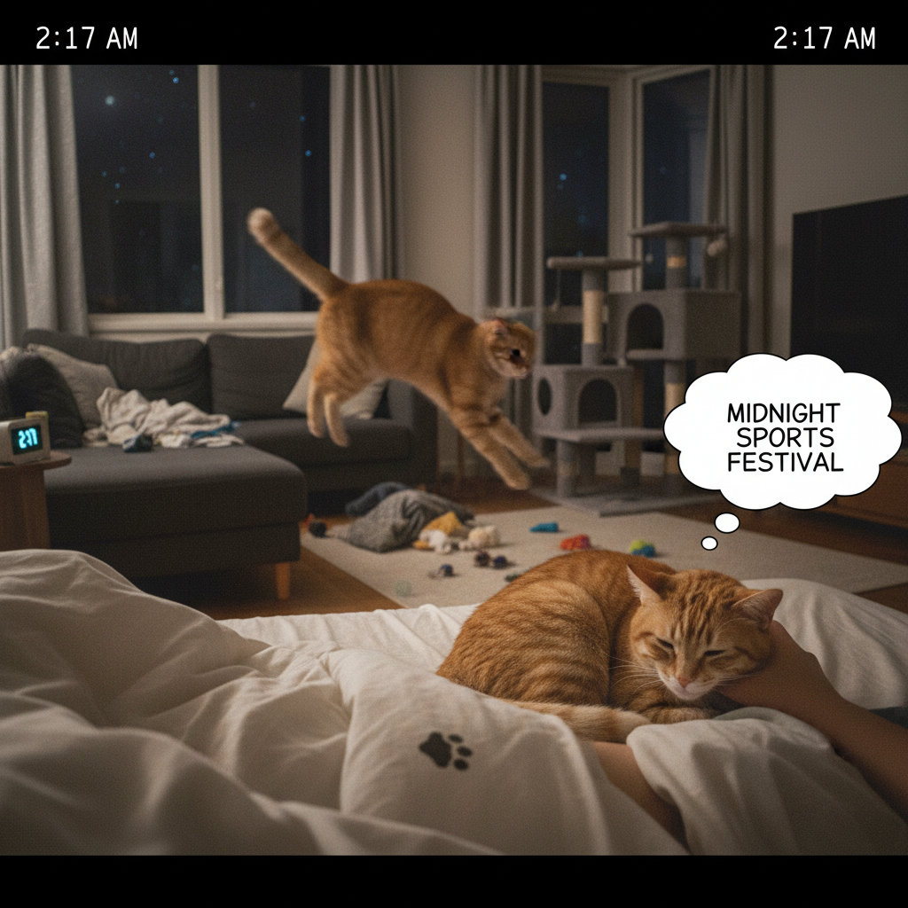 理由は明白で、リビングから聞こえてくる「ドタドタドタッ」という足音と、何かが倒れる音。うちの猫、名前はムギだけど、この時間帯になると突然スイッチが入る。昼間はソファの上で丸まって微動だにしないくせに、人間が寝静まったころを見計らって突然アスリートに変身するのだ。最初の数日は「具合が悪いのかな」と心配して起き上がっていた。今はもう諦めている。