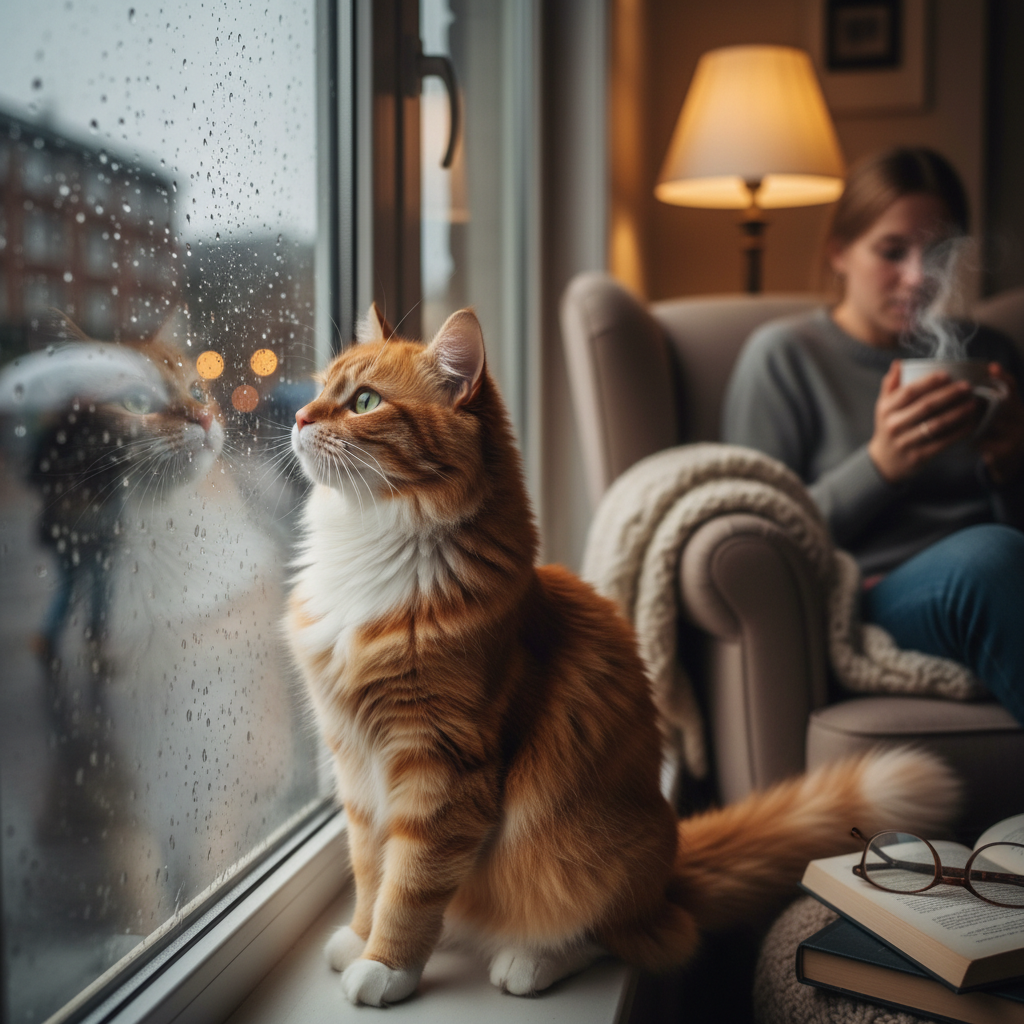 外を歩く人が、また一人。今度は犬を連れている。レインコートを着た小さな犬。猫の視線が、その犬を追う。でも、吠えるわけでも、威嚇するわけでもない。ただ、見ているだけ。犬が視界から消えると、また雨を見る。