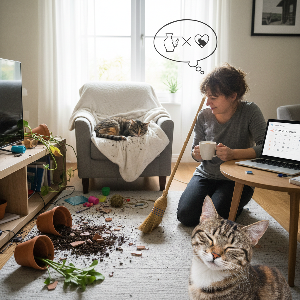 で、今朝。起きてリビングに行ったら、テーブルの上にあったはずの小物入れが床に落ちていて、中身が全部バラバラ。ヘアゴムとかクリップとか、小銭とか。それだけならまだいい。問題は観葉植物だった。鉢ごとひっくり返っていて、土が絨毯の上に盛大にこぼれている。その真ん中で、猫はすやすや寝てるわけ。しかも土まみれの前足を顔の下に入れて、幸せそうに。