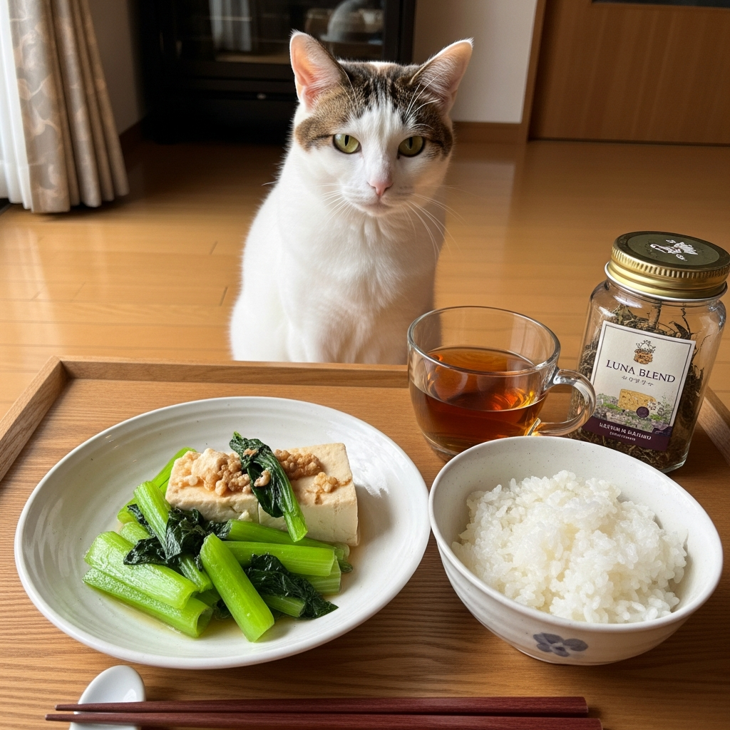 猫と暮らすようになってから、食事の時間が少し変わったかもしれない。以前はスマホを見ながら、あるいは何かしながら食べることが多かった。でも今は、コムギがそこにいるだけで、なんとなく「ちゃんと食べよう」という気持ちになる。誰かに見られている、というより、誰かと一緒にいる、という感覚に近い。