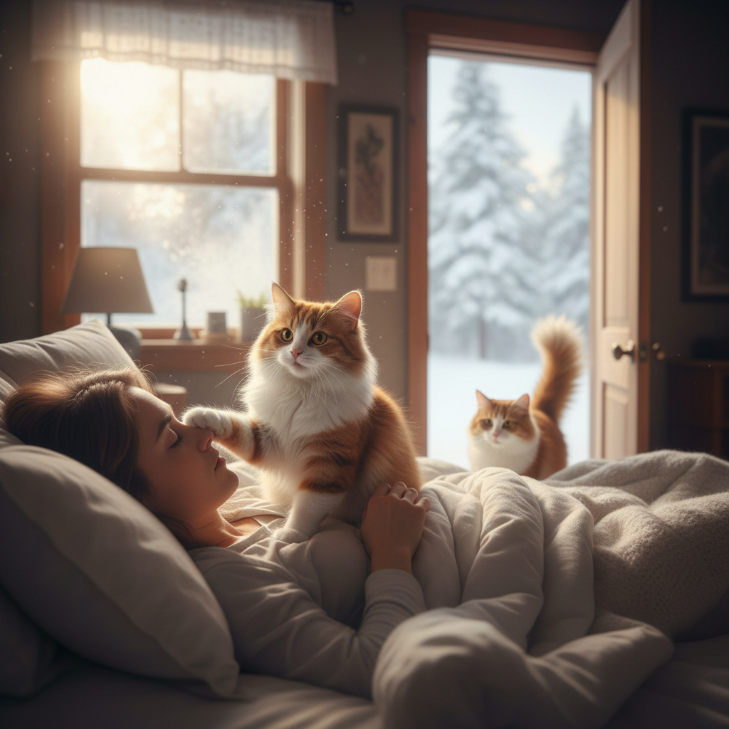 私は目を閉じたまま、もう少しだけこの時間を引き延ばそうとした。しかしトロは諦めない。次に彼女が取った行動は、私の鼻先に自分の鼻を近づけ、ひげで私の顔をくすぐるというものだった。猫のひげというのは思いのほか固く、チクチクとした感触が頬に触れる。それでも私が反応しないでいると、今度は小さな声で「にゃあ」と鳴いた。その声は控えめで、まるで「起こしてしまって申し訳ないのですが」と言っているようだった。