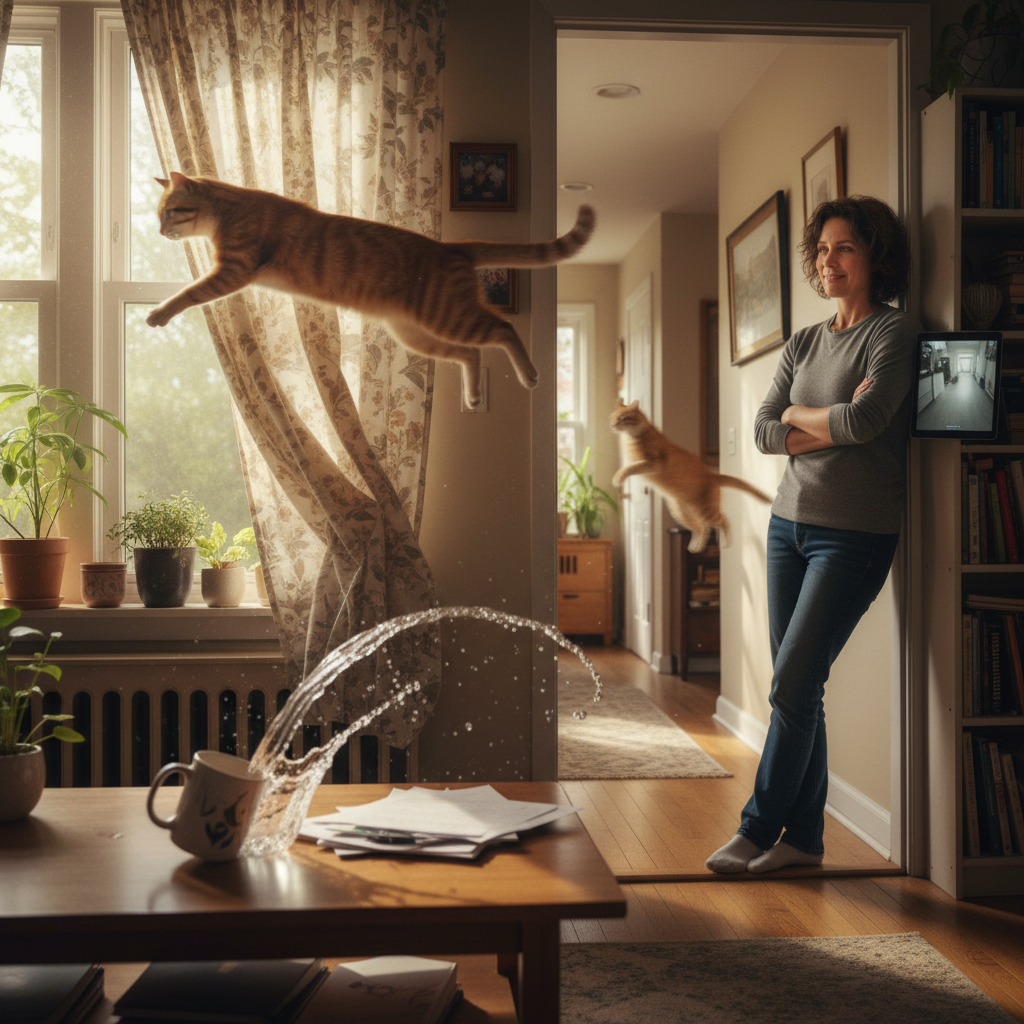 うちの猫は本当に賑やかで、静かにしてる時間なんて寝てる時くらいしかない。いや、寝てる時でさえ寝言みたいな声を出すから、完全に静かな瞬間なんて存在しないのかもしれない。今朝もカーテンレールの上を全力疾走して、着地に失敗してテーブルの上のコップを倒した。水がこぼれる音で目覚めるって、目覚まし時計より確実だけど、こっちの精神にはよくない。